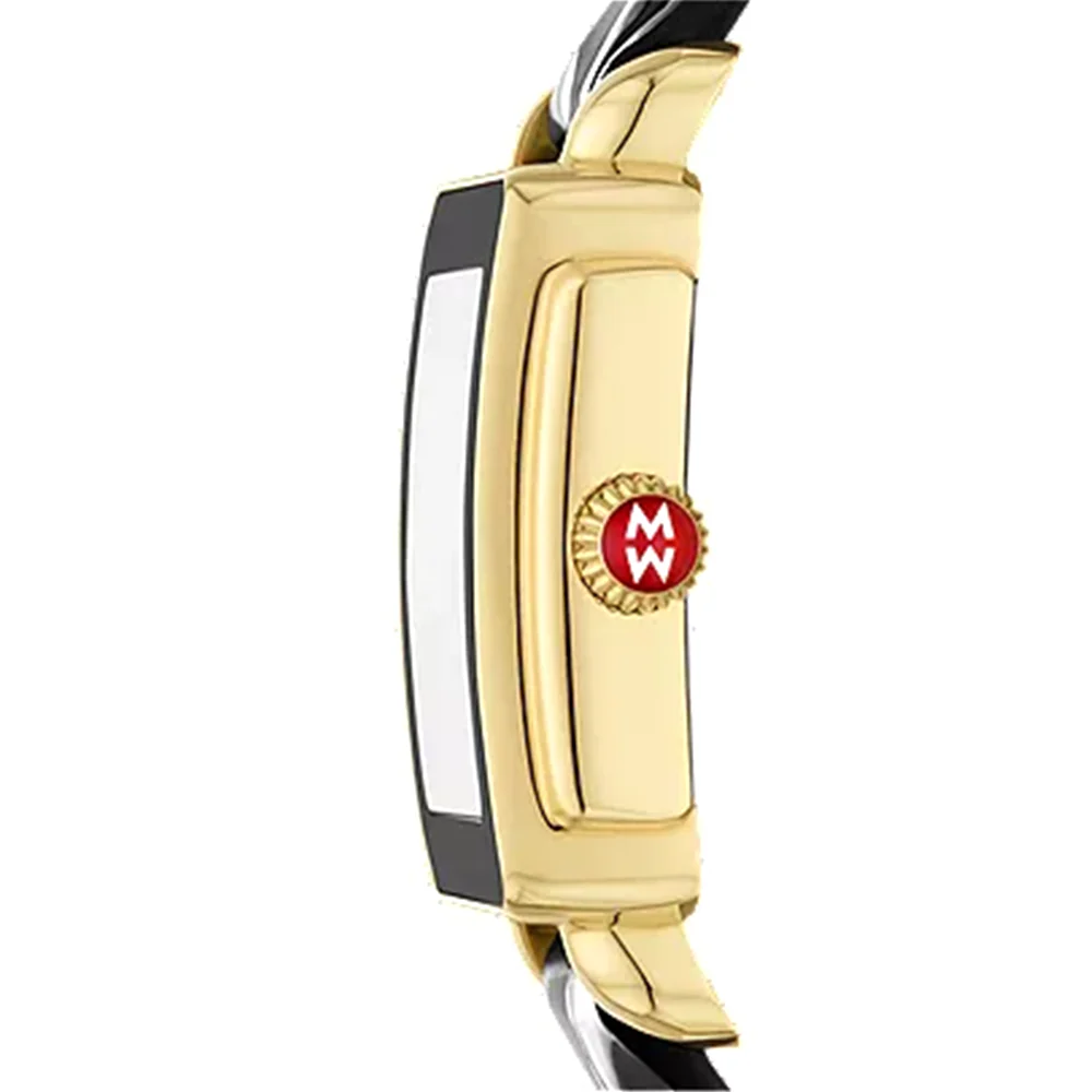 The Deco Mid Sport combines a noir color with refined design. Its 31mm rectangular gold-tone stainless steel case frames a glossy black dial, accented with polished roman numeral indexes and a sub-second movement. The shiny, croco-embossed leather strap, is interchangeable with any 16mm strap from MICHELE's collection, adding versatility to the design.