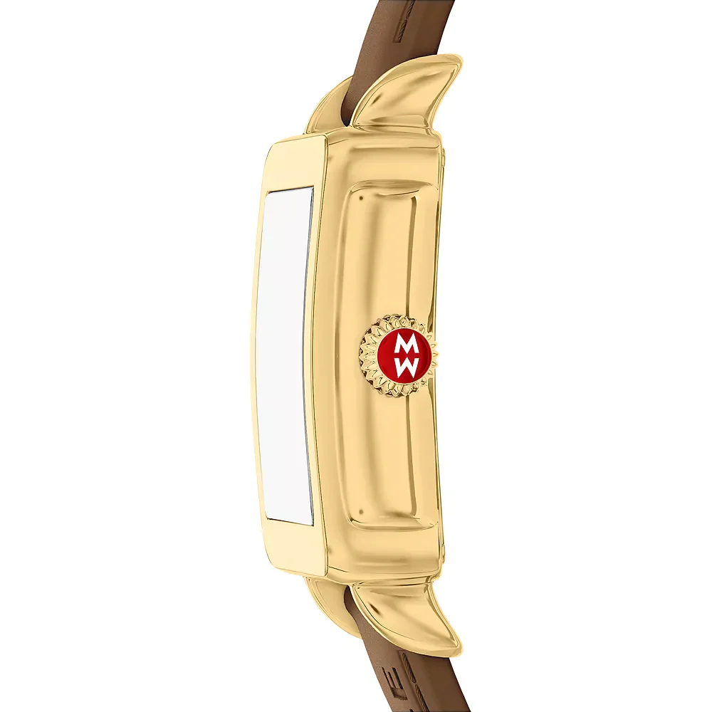 The Deco Sport Mid combines a brown color with refined design. Its 31mm rectangular stainless steel case frames a white sunray dial, accented with polished roman numeral indexes and a sub-second movement. The brown silicone strap, is interchangeable with any 16mm strap from MICHELE's collection, adding versatility to the design.