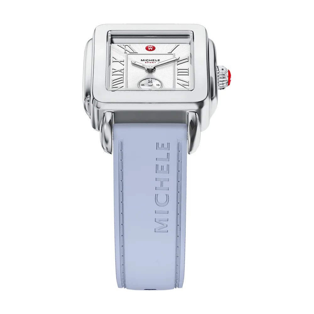 The Deco Sport Mid combines a vibrant pastel blue color with refined design. Its 31mm rectangular stainless steel case frames a white sunray dial, accented with polished roman numeral indexes and a sub-second movement. The pastel blue silicone strap, is interchangeable with any 16mm strap from MICHELE's collection, adding versatility to the design.