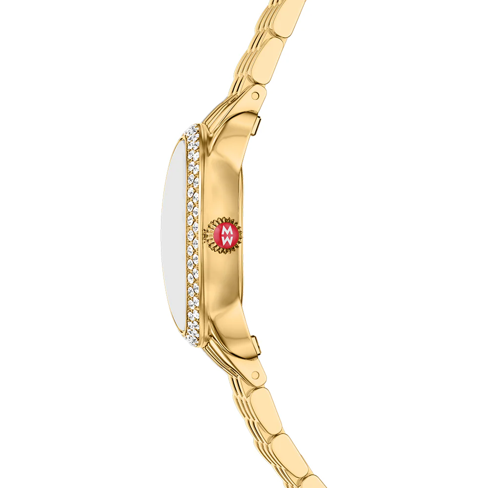This petite 18K gold-plated oval timepiece perfectly balances vintage-inspired style with a modern edge. The white mother-of-pearl dial shines with 112 diamond accents (0.38 carat weight) and Swiss movement. The 18K gold-plated bracelet is made specifically for the Serein Oval collection and is interchangeable with any 12mm MICHELE strap.