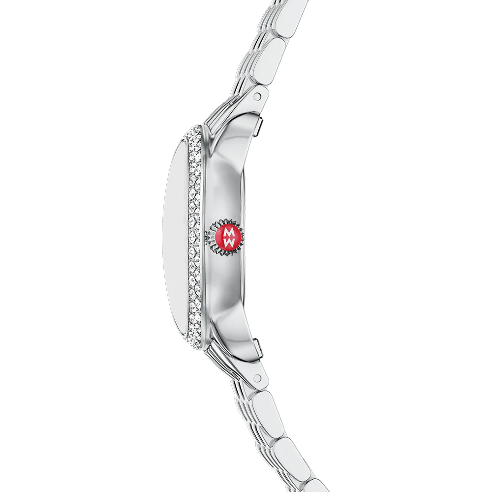 This petite stainless steel oval timepiece perfectly balances vintage-inspired style with a modern edge. The white mother-of-pearl dial shines with 112 diamond accents (0.38 carat weight) and Swiss movement. The stainless steel bracelet is made specifically for the Serein Oval collection and is interchangeable with any 12mm MICHELE strap.